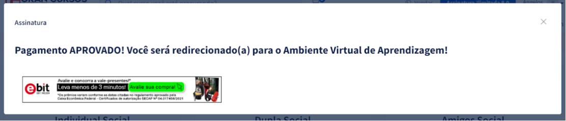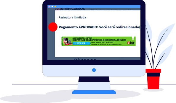 Agora é só acessar a sua conta e iniciar seus estudos! Se o pagamento for por boleto, seu acesso será liberado em até 3 dias úteis, após a confirmação pelo banco. Se o pagamento for por cartão de crédito, sua Assinatura será automaticamente liberada!
