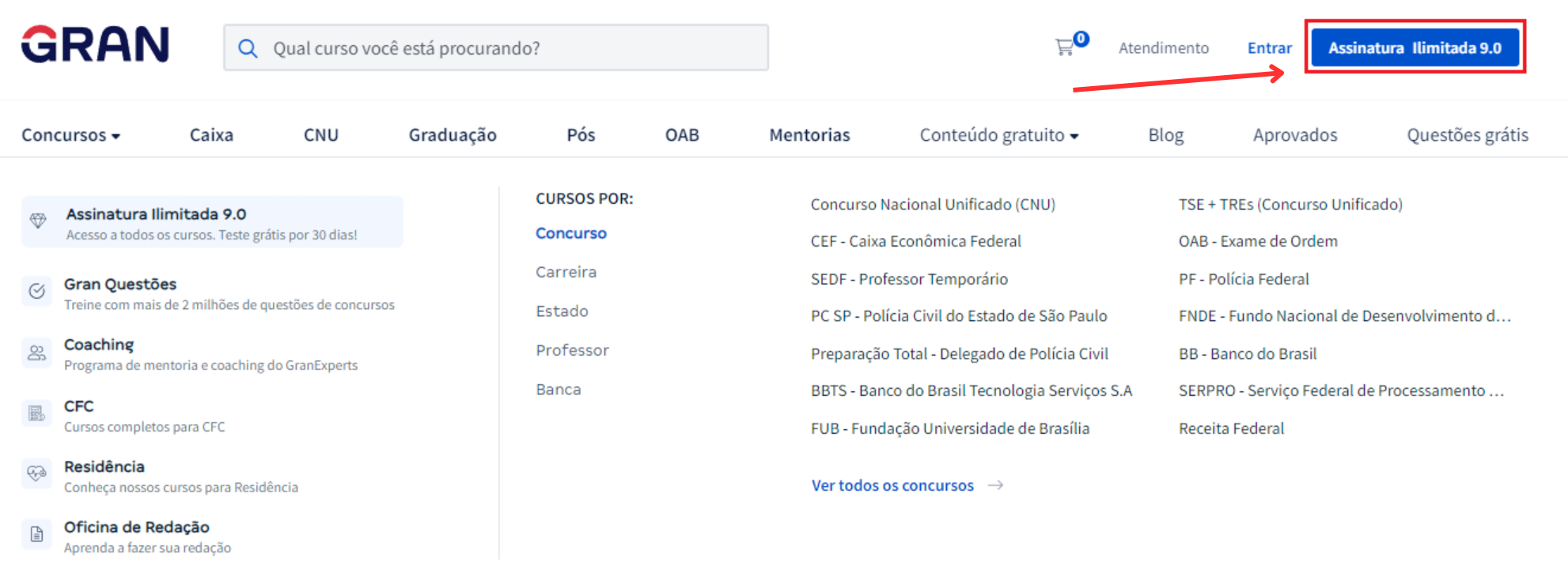 No site do Gran, clique no botão “Assinatura Ilimitada X”, localizado no canto superior direito do menu superior.