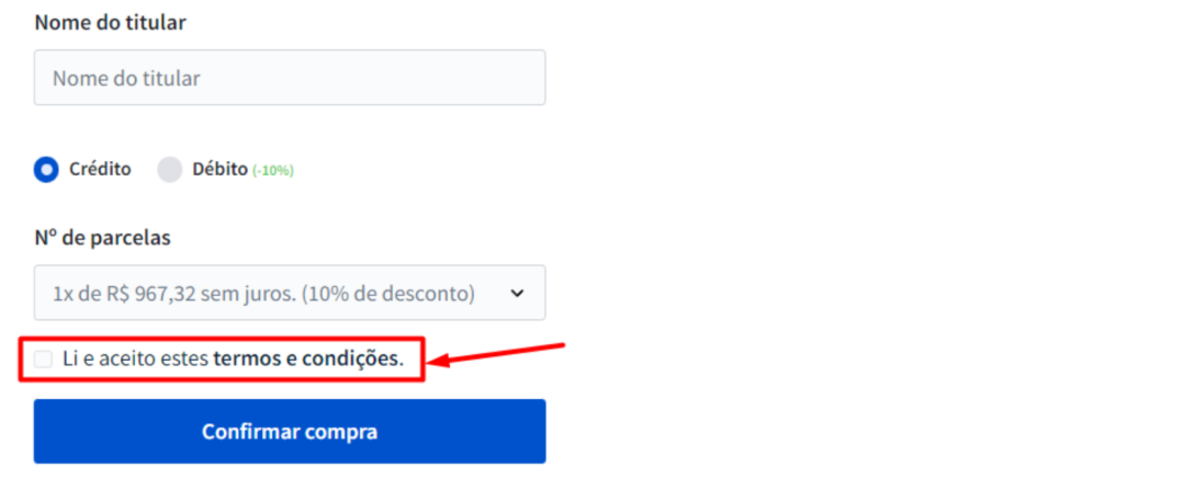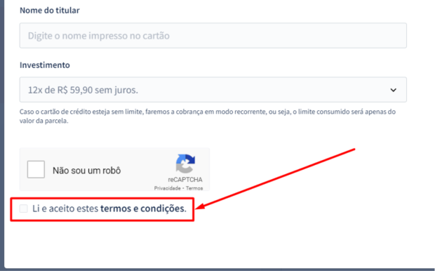 Após a leitura dos termos e condições, é necessário marcar o texto "Li e aceito estes termos e condições”, para confirmar que você concorda com as nossas cláusulas contratuais.