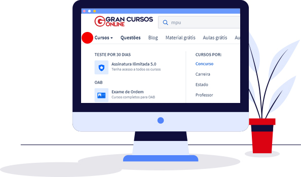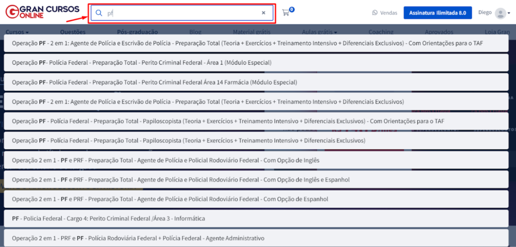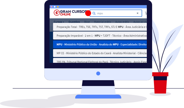 Digite o nome do concurso desejado na barra de pesquisa (por exemplo, "MPU"). O resultado aparecerá logo abaixo da barra de pesquisa com todos os cursos relacionados ao concurso que você deseja.