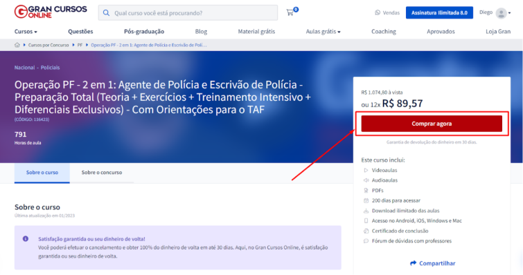 professores e informações sobre o concurso. Para comprar, é só clicar no botão "Comprar agora"!