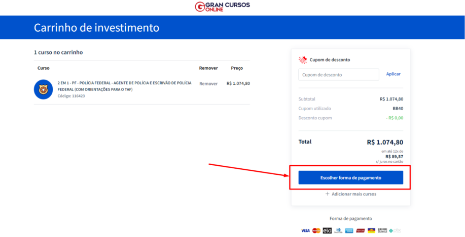mais cursos, clique em "Adicionar mais cursos". Caso você tenha um cupom de desconto,