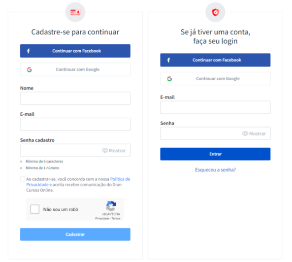 Caso você já tenha cadastro, basta digitar seu e-mail e senha, ou continuar com o Google ou com o Facebook.