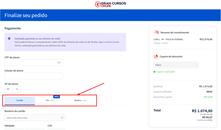 Confira o curso selecionado e o valor total a pagar. Se desejar selecionar