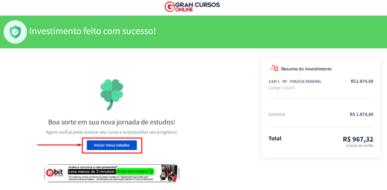 Agora é só acessar a sua conta e iniciar seus estudos! Se o pagamento for por boleto, seu acesso será liberado em até 3 dias úteis, após a confirmação pelo banco. Se o pagamento for por cartão de crédito, seu curso será automaticamente liberado!